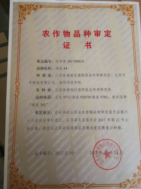 通過審定。適宜在江蘇省沿淮麥區及淮北麥區晚茬口種植