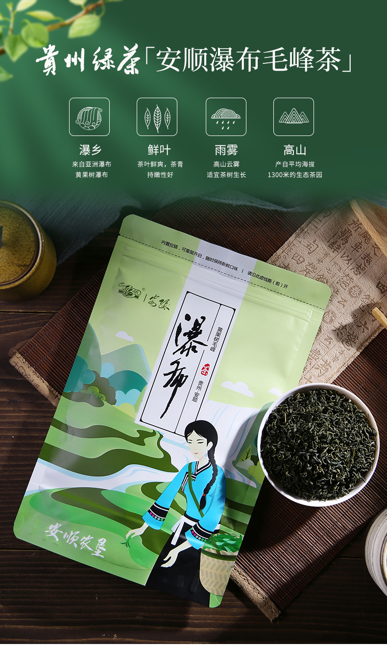 瀑布茶品牌是安順市人民政府主打茶葉品牌,省級重點打造區域公共品牌,屬貴州五大名茶,先后獲得獲“中國農產品區域公用品牌”、“貴州省著名商標”“貴州省名牌產品”等榮譽稱號近年來,在各級部門大力推動下,瀑布茶品牌不斷發展壯大。截止目前,現有瀑布茶品牌加盟企業23家,輻射茶園面積200000余畝其中綠色食品認證茶園基地面積7000余畝,有機食品認證基地面積2500畝擁有“瀑布毛峰”、“瀑布翠芽”“瀑布紅茶”、“瀑布翠龍”等產品,多次獲得“中綠杯”、“中茶杯”、“華茗杯”大獎;分別榮獲14屆中國國際農產品交易會金獎18屆中國綠色食品博覽會金獎“黃山杯”首屆全國傳統名茶產品質量特別金獎、安順十大旅游商品等殊榮及稱號。