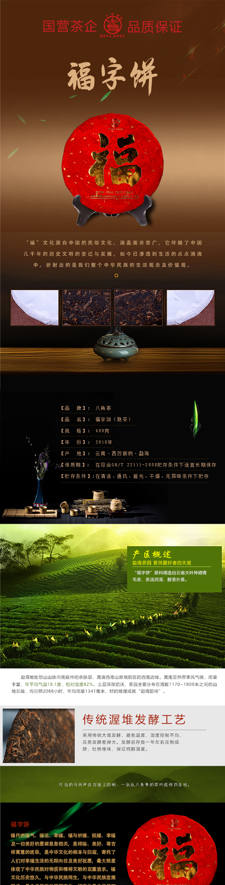 ??——八角亭茶業公司:經營方式為生產加工、銷售,主營普洱茶、緊壓茶、兼營毛茶收購。目前以生產、加工、銷售“八角亭”系列普洱茶為主,是云南省農業產業化龍頭企業。“八角亭”商標獲得云南省著名商標,“八角亭”牌普洱茶榮獲云南省名牌產品和云南省名牌農產品。已先后通過工業生產許可證、ISQ9001與HCCP認證、云茶牌認證(YC)等項工作,在歷次專業評比中“八角亭”普洱茶多次獲得特等金獎和金獎。2017年5月,“八角亭”牌老班章茶葉獲得了有機茶資格認證。八角亭茶業公司多次進行了技術改造,現已建立了標準化生產車間和設備,年設計生產量達3000噸,是整個公司的主體核心企業。