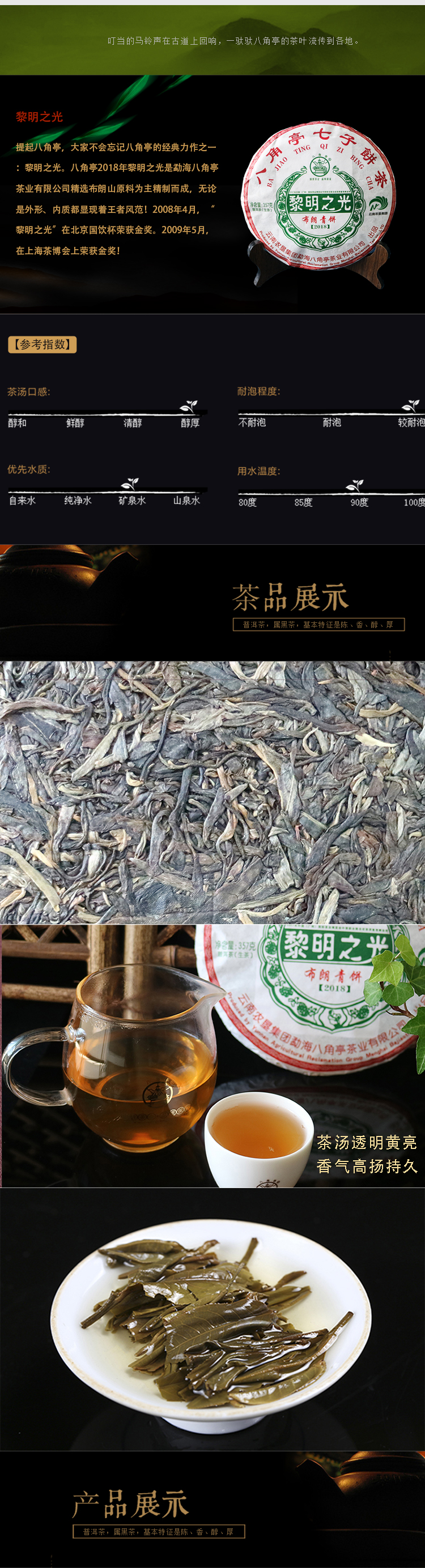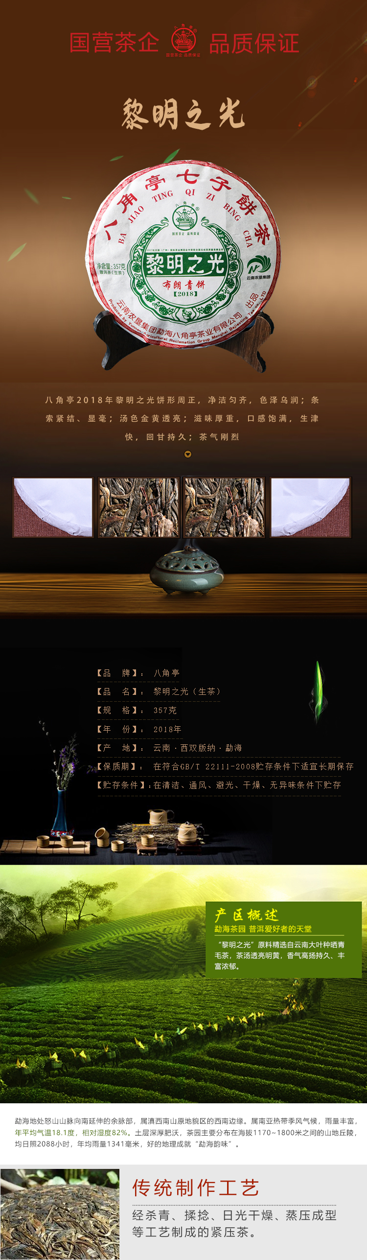 云墾茶業(yè)集團下屬茶葉生產(chǎn)企業(yè)——云南農(nóng)墾集團勐海八角亭茶業(yè)有限公司原名黎明茶廠,是我國歷史最為悠久的茶企之一,曾位列“中國普洱茶十大知名品牌”“十大最受歡迎茶葉品牌”、“中國普洱茶十大暢銷品牌”中,成為今天市場上最有影響力的品牌之一。公司產(chǎn)品獲得“綠色食品”、ISO9001、 HACCP和云茶品牌(YC)4項認證,連續(xù)獲得“云南名牌農(nóng)產(chǎn)品”“云南名牌產(chǎn)品”“云南省著名商標”等品牌榮譽,公司生產(chǎn)的多款普洱茶在歷次專業(yè)評比中多次獲得特等金獎和金獎。在2018第五屆中國企業(yè)五星品牌論壇上,云南農(nóng)墾集團勐海八角亭茶業(yè)有限公司上榜中國普洱茶行業(yè)影響力品牌——“金芽獎”,公司負責(zé)人陳勝軍先生獲“陸羽獎”,被授予2017“國際十大杰出茶人”榮譽稱號。